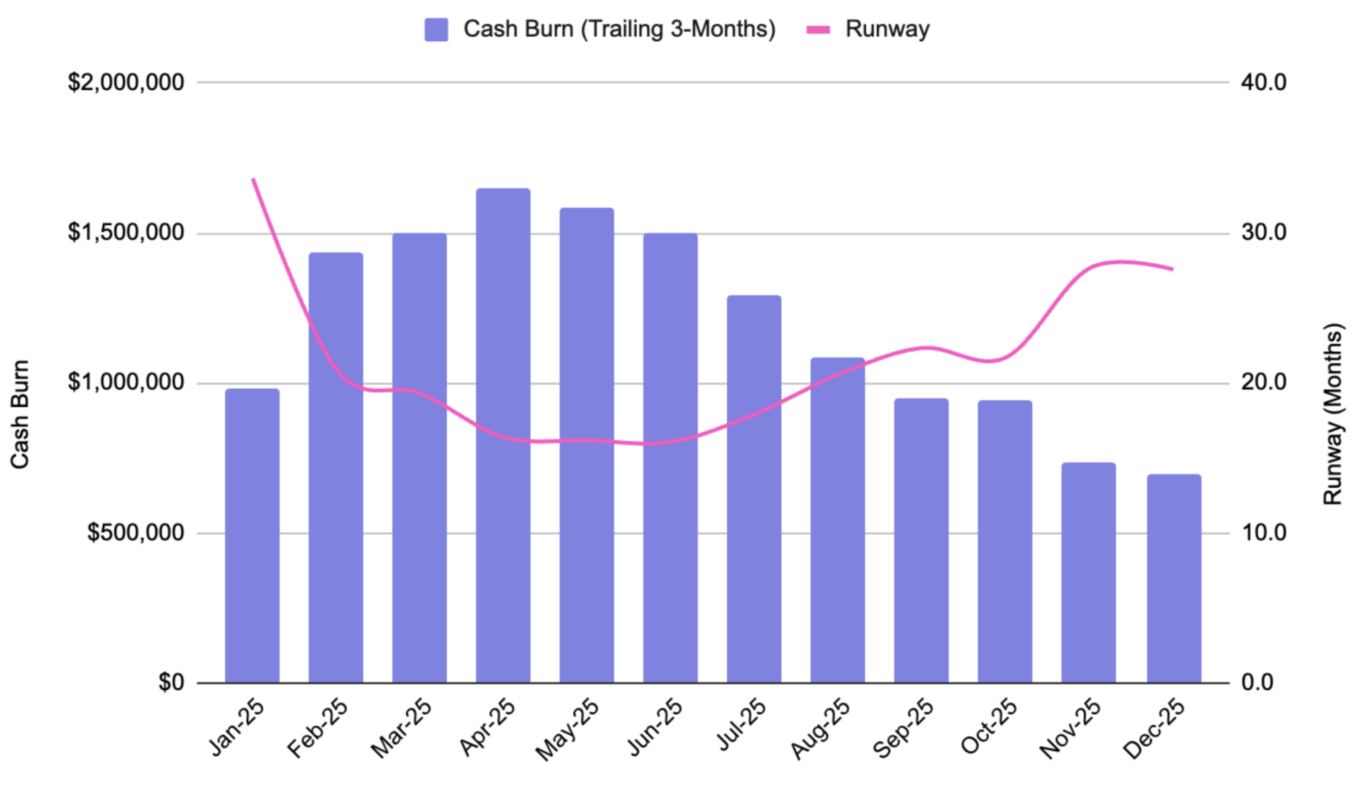 You can see the stage of peak irrationality before the reset in the chart. Runway plummeted from 35 months in January to just 16 months in May (i.e. we burned through nearly 20 months of runway in 4 months).