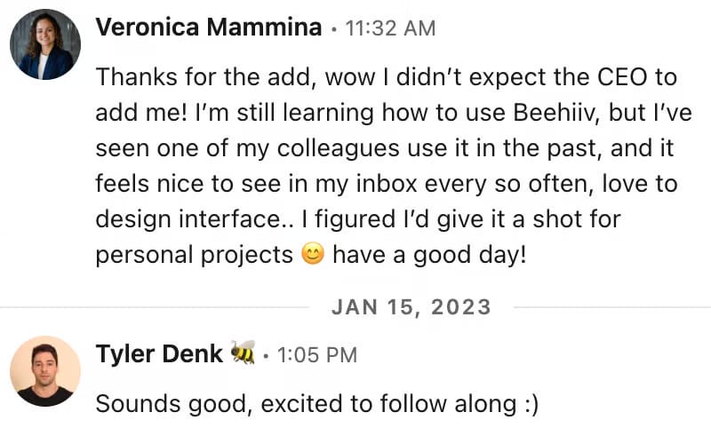 In the early days, I would go through every single person who engaged with my content and shoot them a message about signing up to beehiiv. Obviously they werenβt all great leads, but some of that outreach converted into large enterprise deals.