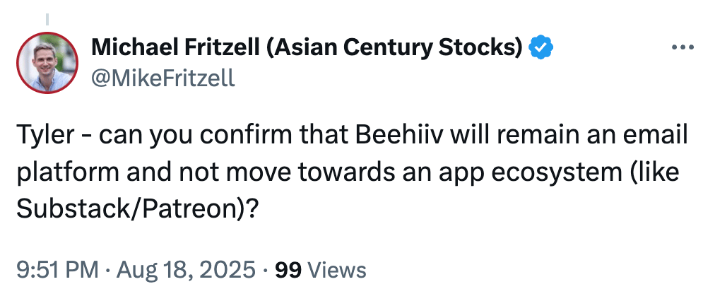 For example, when writers grow tired of paying Substack a 10% fee for a simple API call, they can simply disconnect their Stripe account and move it to beehiiv (which doesnβt extort revenue from its writers).