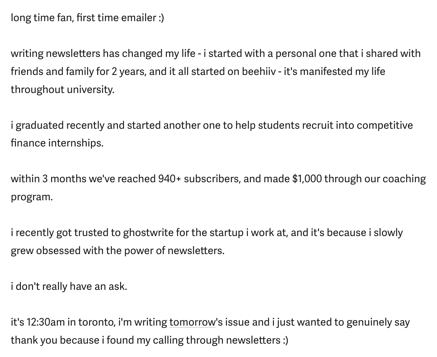 And I believe that beehiiv can (and will) change the lives of so many others. I have heard so many stories like those above, it was difficult to choose just a few.